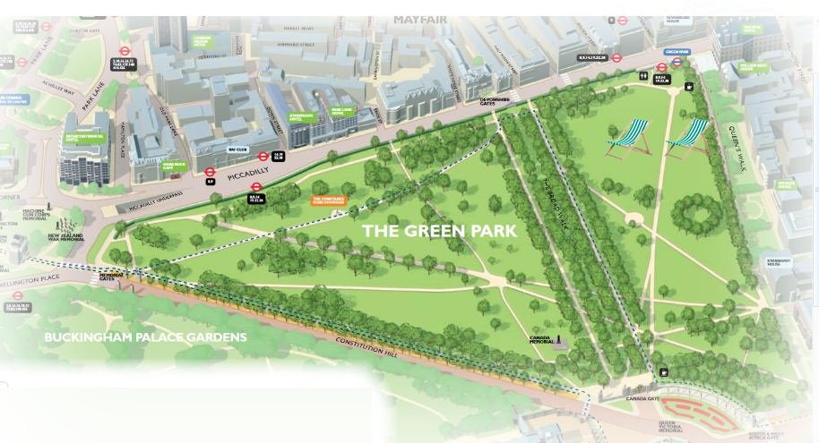 The Green Park is one of London’s eight Royal Parks, a peaceful triangle of mature trees and grasslands offering a quiet retreat from city life.